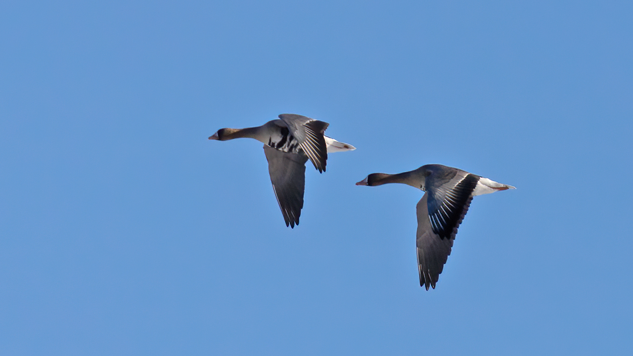 | Vilsted Sø 13. februar Ved 15-tiden kørte vi til Vilsted Sø. Der er stadig åbent vand et langt stykke ud, men på grund af tilstedeværelse af lysfiskere havde fuglene trukket sig langt væk uden for fotoafstand. Overvejende pibeænder, men også en enkelt lille lappedykker og få gråænder. Hvor var sangsvanerne? Det fandt vi ud af, da vi kørte ad Munksjørupvej og stoppede op mellem de to søer. Den lille sø er tilfrosset, og her stod sangsvanerne. Fra øst bevægede en stor flok bramgæs sig hen mod søen, men tog en drejning, da de opdagede os. Jeg blev straks opmærksom på blisgæssene ved deres karakteristiske stemme. Dejligt, at de er her nu. Sidste vinter så jeg dem ikke. |
