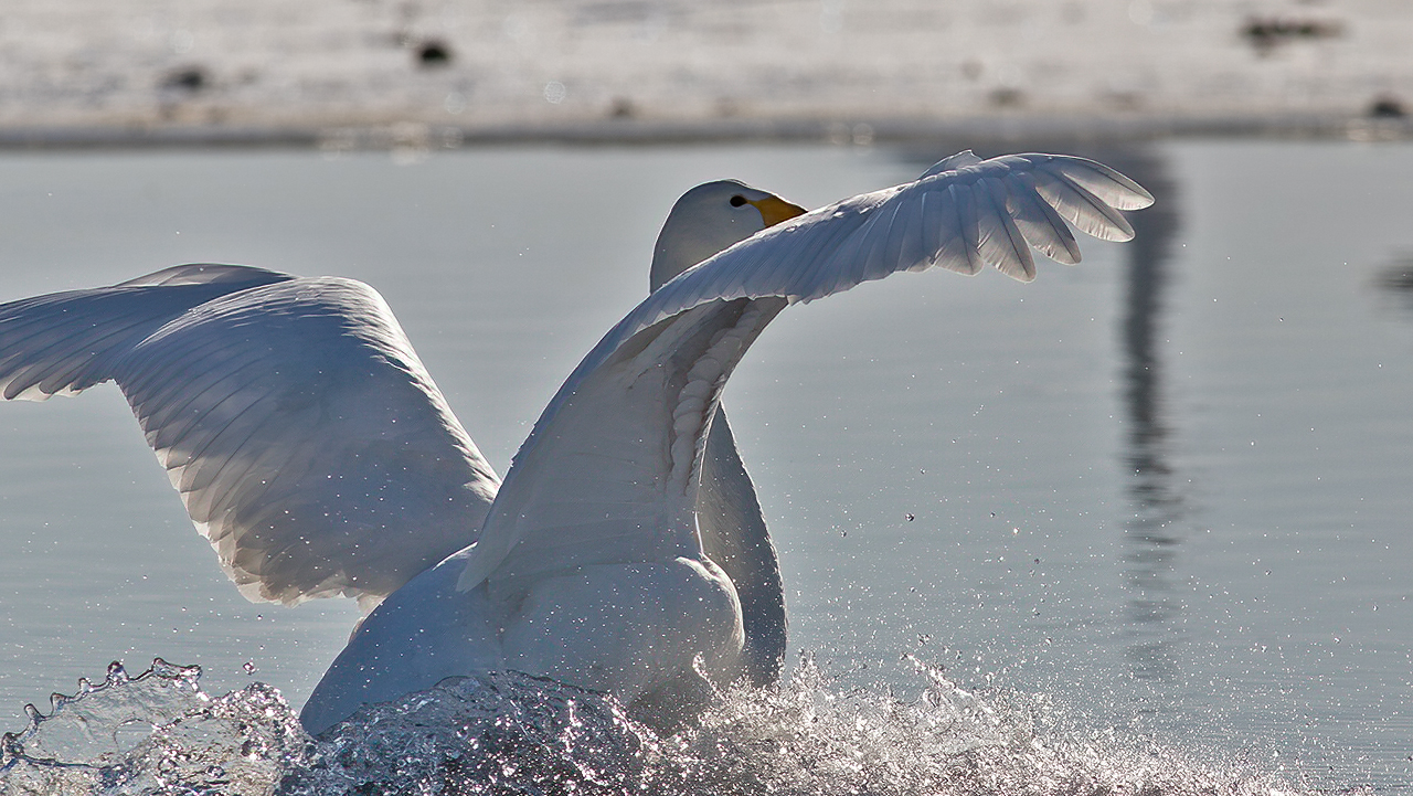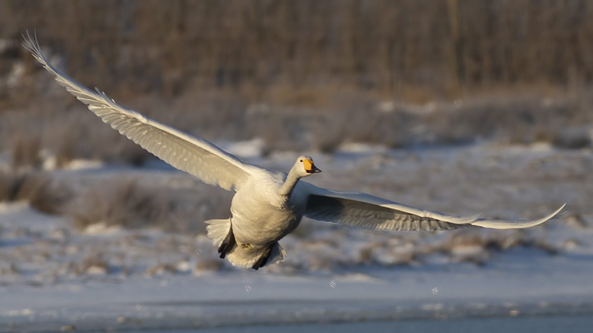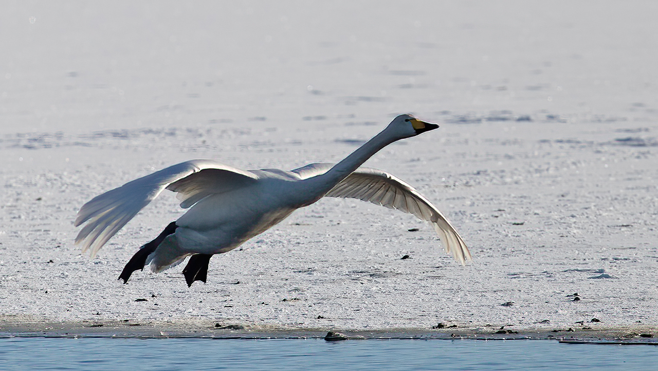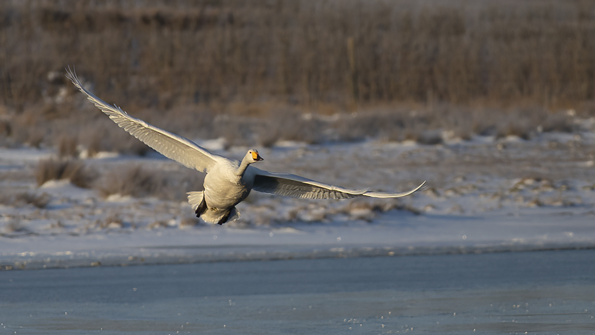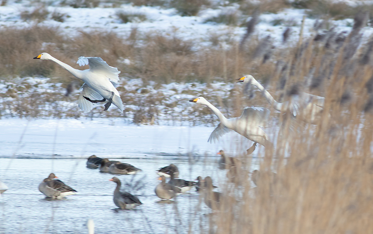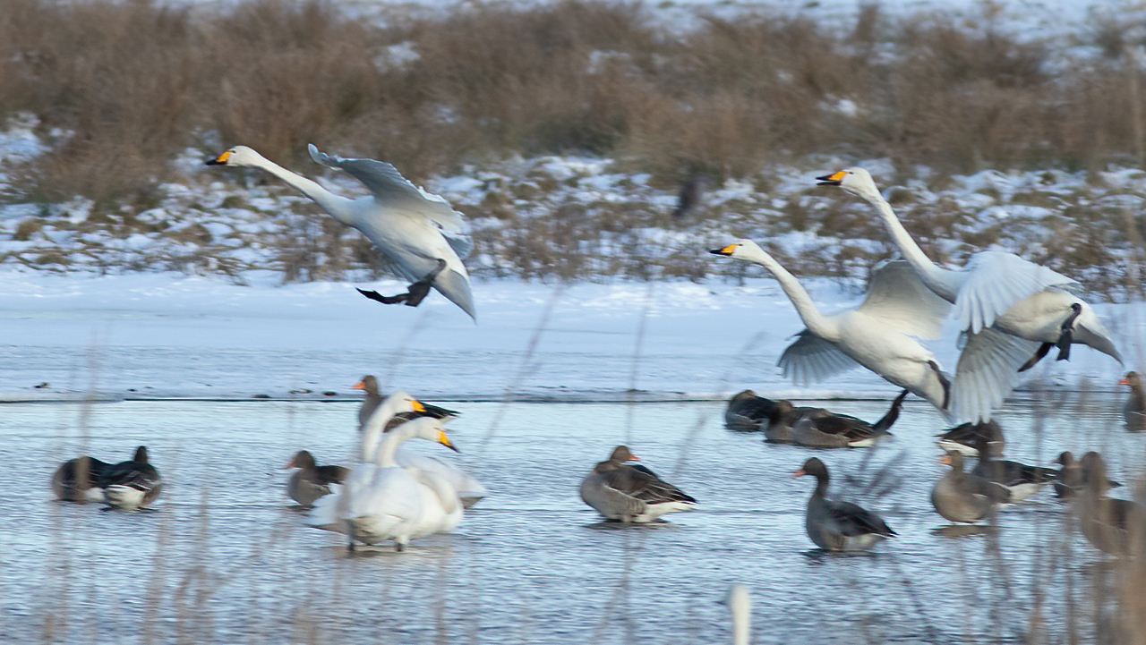 | Vilsted Sø torsdag den 18. februar I flot solskin stod nogle få sangsvaner på isen ved Vilsted By. Nogle få sangsvaner kom flyvende mod mig og landede på vandet. Længere mod vest lå der mange fugle, men de ligger skjult af tagrørene, når man går ad stien mod vest, så de er ude af fotomuligheder. Man hører grågæssene. Små flokke af blisgæs flyver over søen mod nordøst. Kan de mon finde snefrie marker at fouragere på? |