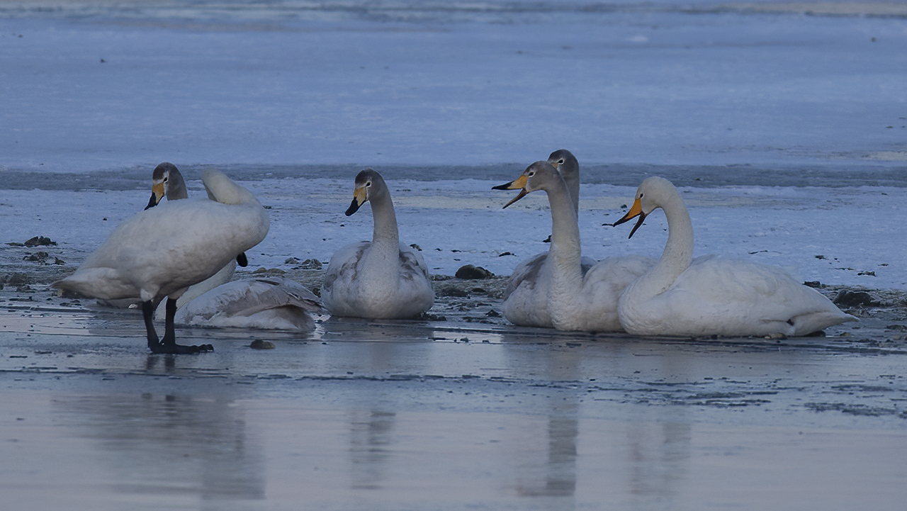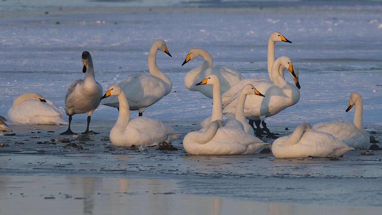 | Vilsted Sø 14. februar kl. 07:30 til 09:15 I morges tog jeg sangsvanerne på sengen. Klokken 07:30, da jeg holdt ind på vigepladsen på Munksjørupvej, sov sangsvanerne. Jeg tog nogle billeder og afventede deres opvågning. Klokken kvarter i ni sov de stadig, men få minutter efter var der en morgenduelig, der rejste hals og så sig omkring. Pø om pø kom der liv i flere, der pudsede sig og "strakte" sig, tog en svømmetur og gjorde flyveøvelser. På modsat side af vejen lå en lille flok i morgendisen. Det varede imidlertid nogle minutter, inden solen ramte dem og desuden sendte lys ud over den isbelagte sø. Jeg forsøgte at tage video med den store tele. Da jeg har haft store problemer med rystede billeder, købte jeg for nogen tid siden en Ziuri Gimbal. Den skulle jeg nu afprøve. Det gik hæderligt, og jeg har nu høstet nogle erfaringer. På et tidspunkt kom der en lille flok svaner flyvende mod mig, og enkelte fra flokken lettede. Det gav mulighed for flugtbilleder. Desværre viste blisgæssene sig ikke. |