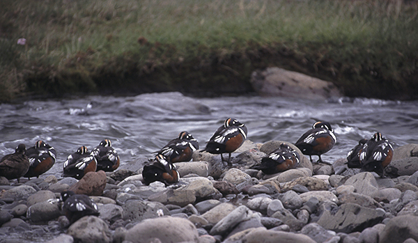 Spændte nærmer vi os Dalsá, en mindre elv, som udmunder i Isafjarðardjüp tæt ved en lille, hvidmalet kirke med rødt tag. Her skulle strømænderne befinde sig. Kort før broen, som fører over elven, stopper vi op og lader blikket gå nedstrøms. Og der! Ude midt i strømmen på en samling store sten ligger fuglene. 50 i alt tæller vi. Selv om det er i fældningstiden, så har langt de fleste stadig det meste af pragtdragten i behold. Og det er slående, hvor godt denne er tilpasset levestedet. Hvor fuglene ligger her mellem brogede sten og hvidskummende strømhvirvler og hviler sig, er de særdeles godt camouflerede.