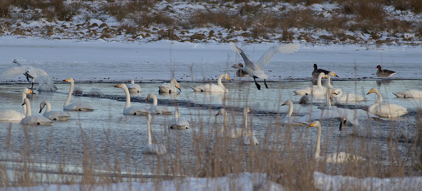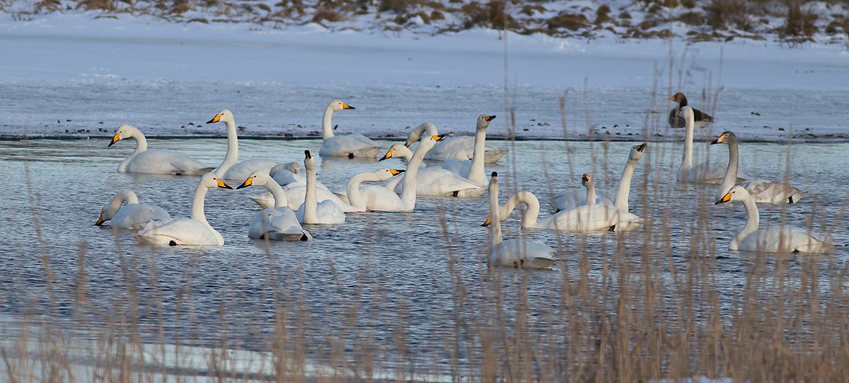 | Vilsted Sø torsdag den 18. februar I flot solskin stod nogle få sangsvaner på isen ved Vilsted By. Nogle få sangsvaner kom flyvende mod mig og landede på vandet. Længere mod vest lå der mange fugle, men de ligger skjult af tagrørene, når man går ad stien mod vest, så de er ude af fotomuligheder. Man hører grågæssene. Små flokke af blisgæs flyver over søen mod nordøst. Kan de mon finde snefrie marker at fouragere på? |