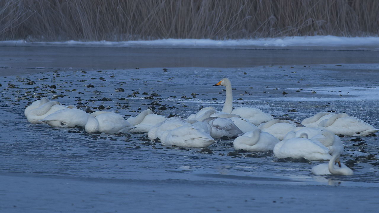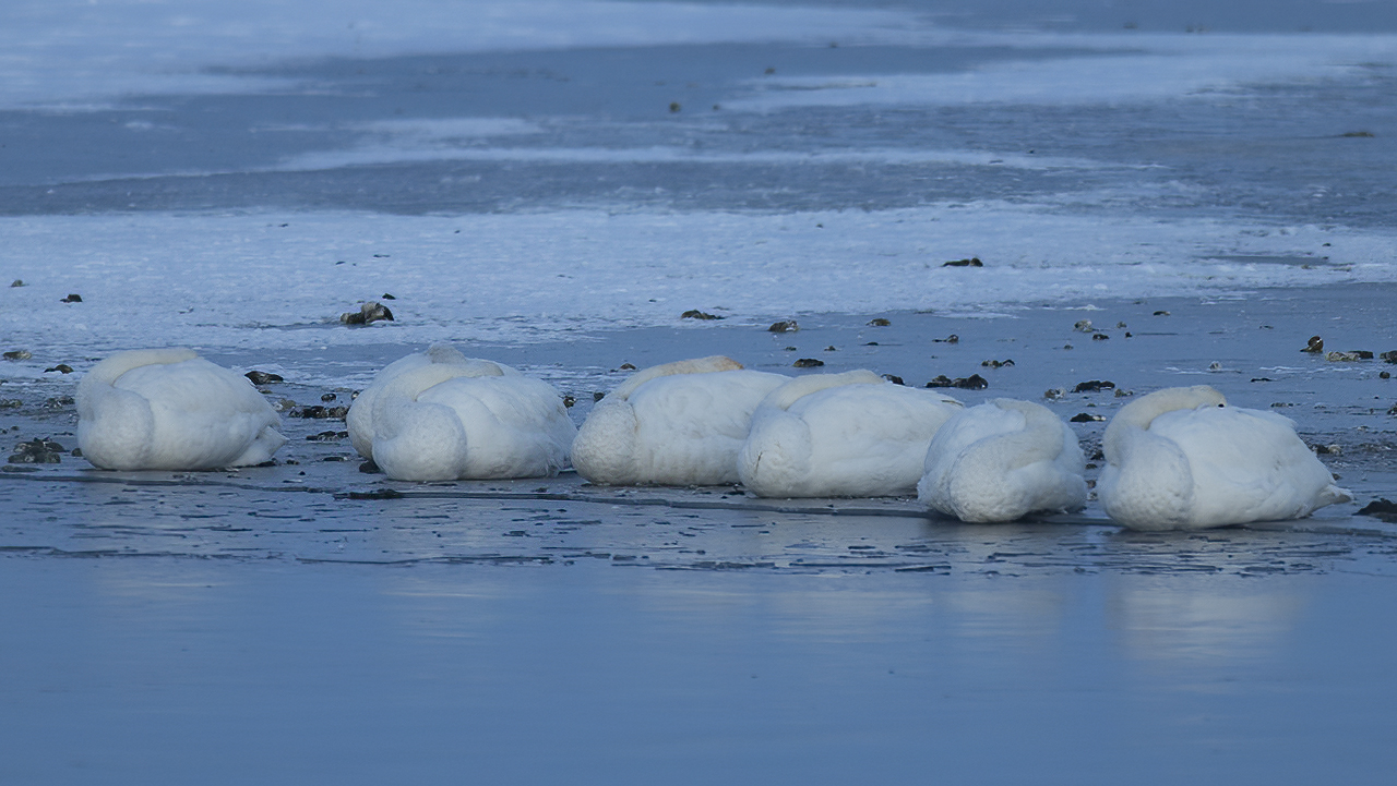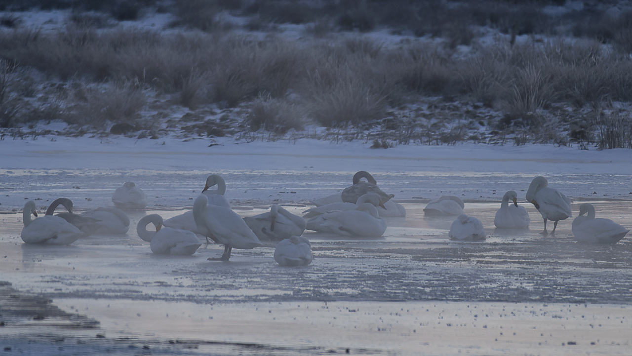| Vilsted Sø 14. februar kl. 07:30 til 09:15 I morges tog jeg sangsvanerne på sengen. Klokken 07:30, da jeg holdt ind på vigepladsen på Munksjørupvej, sov sangsvanerne. Jeg tog nogle billeder og afventede deres opvågning. Klokken kvarter i ni sov de stadig, men få minutter efter var der en morgenduelig, der rejste hals og så sig omkring. Pø om pø kom der liv i flere, der pudsede sig og "strakte" sig, tog en svømmetur og gjorde flyveøvelser. På modsat side af vejen lå en lille flok i morgendisen. Det varede imidlertid nogle minutter, inden solen ramte dem og desuden sendte lys ud over den isbelagte sø. Jeg forsøgte at tage video med den store tele. Da jeg har haft store problemer med rystede billeder, købte jeg for nogen tid siden en Ziuri Gimbal. Den skulle jeg nu afprøve. Det gik hæderligt, og jeg har nu høstet nogle erfaringer. På et tidspunkt kom der en lille flok svaner flyvende mod mig, og enkelte fra flokken lettede. Det gav mulighed for flugtbilleder. Desværre viste blisgæssene sig ikke. |